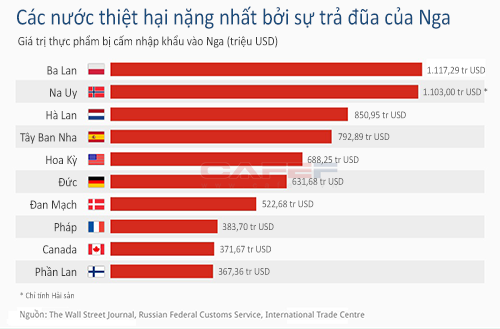 Theo dữ liệu chừng mới nhất của Trung tâm Thương mại quốc tế, Ba Lan và Na Uy là hai nhà nước thiệt hại nặng nề nhất.Ba Lan, nước xuất khẩu nhiều thực phẩm nhất sang EU (chủ yếu là trái cây), sẽ phải dẫn giải quyết đầu ra cho hơn 1,1 tỷ USD phải chi trị trái cây không còn được nhập cảng vào Nga. Ngành thủy thuỷ sản của Na Uy cũng đang cuống cuồng tìm kiếm những thị trường học xuất khẩu mới khi mà Na Uy trước đây xuất cảng hơn 1 tỷ USD giá như trị thủy sản (chủ yếu là cá hồi) sang thị trường Nga.